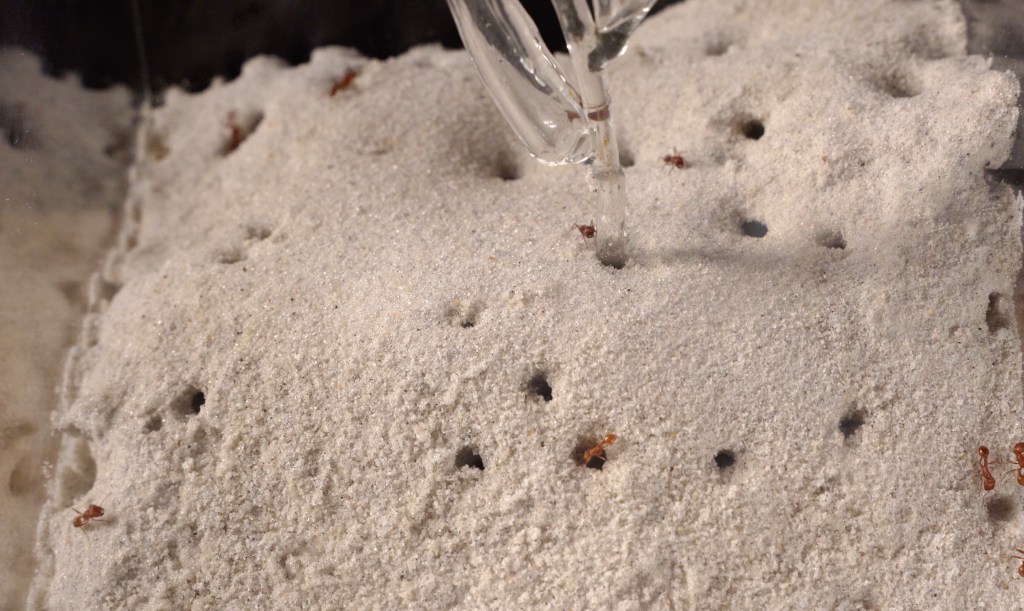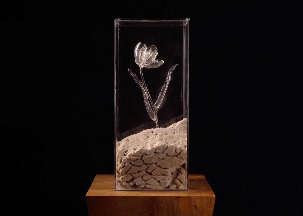 Harvester ants make this fake environment their home by tunneling new paths and even setting up a grave yard for their dead. Without a queen, they simply work until they die. The ghostly flower is placeholder for nature but can never truly interact with the living things that surround it.